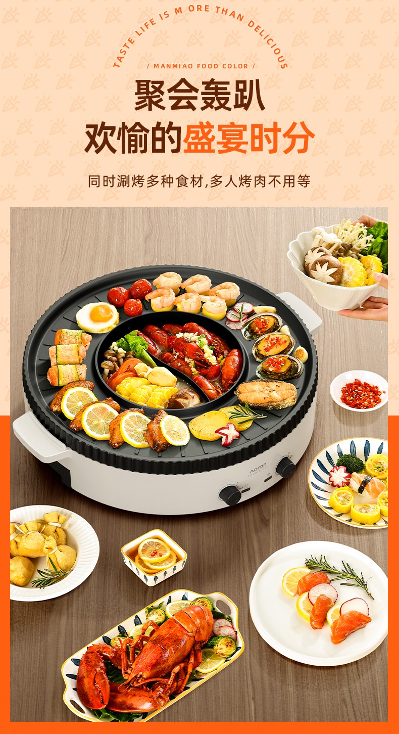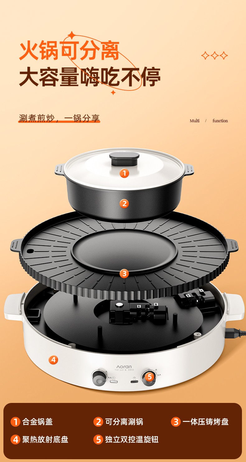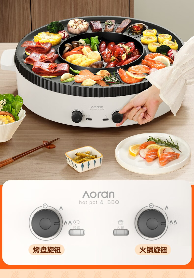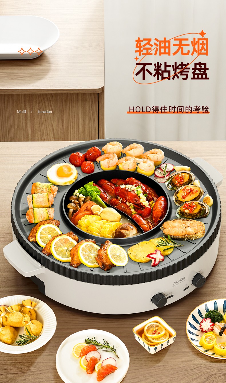 奥然电烤炉多功能烤涮一体锅家用无烟电烤肉盘烤串机多功能涮烤料理火锅分体式烤肉锅【超特大号】烤涮一体-圆锅单分离|3-15人